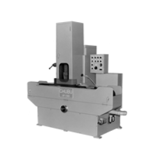 この研削盤は従来の研削盤の砥石のかわりに研削ベルトを使用したコンベアータイプの平面ベルト研削盤です。本機は時間当りの研削量が極めて大きいこと、研削精度が良いこと、操作性の容易なこと等がその特長です。鋼や鋳鉄など磁性材料の加工にはコンベアー下の強力電磁プラテンが、また黄銅、アルミ、プラスチックなどの非磁性体には品物押えロールが補助的な保持力を発揮して、品物が自動送りされます。